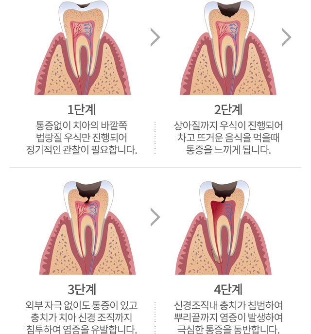하지만 통증이 심하지 않아 치료를 미루다 보면 점점 충치는 더 심해져 긴 시간 큰 비용이 드는 치료가 필요하게 되는 경우가 많습니다.
